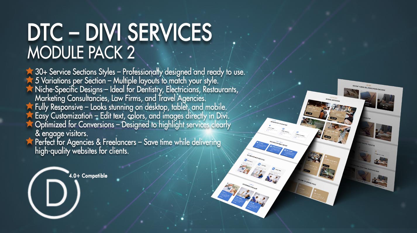 Get DTC – Divi Services Module Pack 2 today and instantly unlock 30+ premium service sections with 5 variations each, designed for :